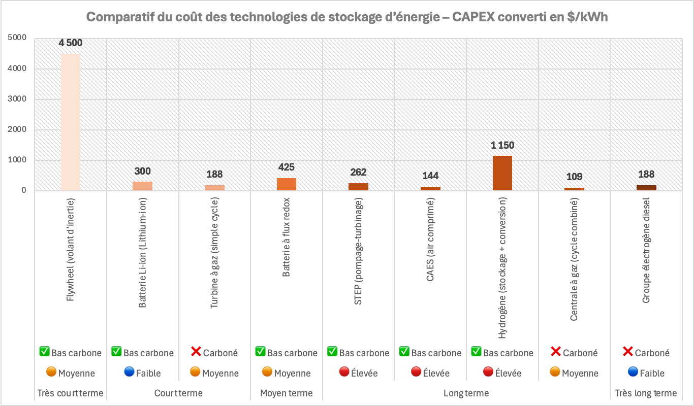 Pour aider à choisir la technologie adaptée, voici une représentation simplifiée des principales technologie utilisées à ce jour. Les valeurs sont des ordres de grandeur issus de publications : le coût est exprimé en $/kWh de capacité installée, catégorisées par temps d'utilisation (très court terme à très long terme), selon la complexité d’installation (faible = facile à déployer, élevée = travaux importants) et son impact en terme d'emission CO2.